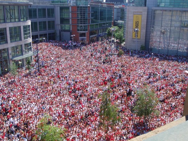 English: Manchester BBC big screen in Exchange Square during the 2006 FIFA World Cup game between England and Paraguay.