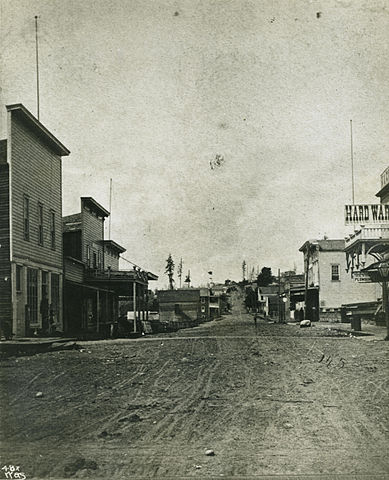 English: Seattle, Washington, USA, Front Street (now First Avenue) looking north (actually N-NW) from around the corner of Columbia Street, c. 1870.