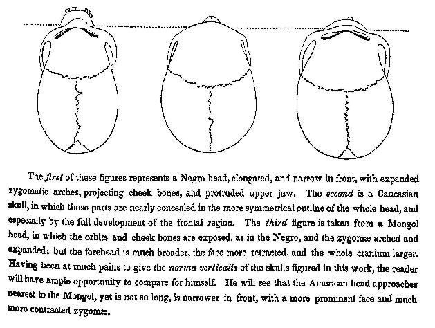 "Samuel George Morton's drawings of "typical" Black, White, and East Asian skulls. This was cropped from an online scan of Morton's Crania Americana."