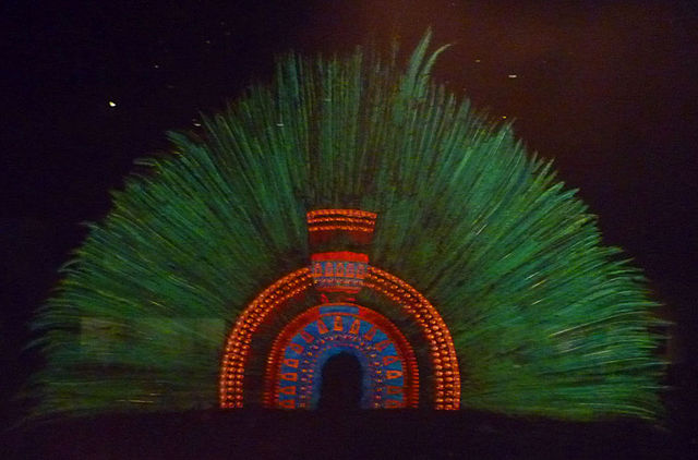 English: Aztec feather headdress attributed to Moctezuma II exhibited at the Museo Nacional de Antropología e Historia, México
