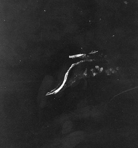 English: The damaged and immobile  en:Japanese aircraft carrier Ryujo (centre) photographed from a USAAF B-17 bomber, during a high-level bombing attack in the  en:battle of the Eastern Solomons on  en:24 August  en:1942. The destroyers Amatsukaze (centre left) and Tokitsukaze (faintly visible, centre right) had been removing her crew and are now underway. The fingerprints are in the original picture.