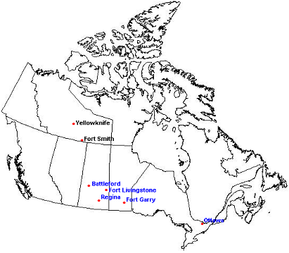 English: Former capitals of Northwest Territories in Canada: Fort Garry (1870–1876), Fort Livingstone (1876-1877), Battleford (1877-1883), Regina (1883-1905), Ottawa (1905-1967), Fort Smith (1911-1967), Yellowknife (1967-present).