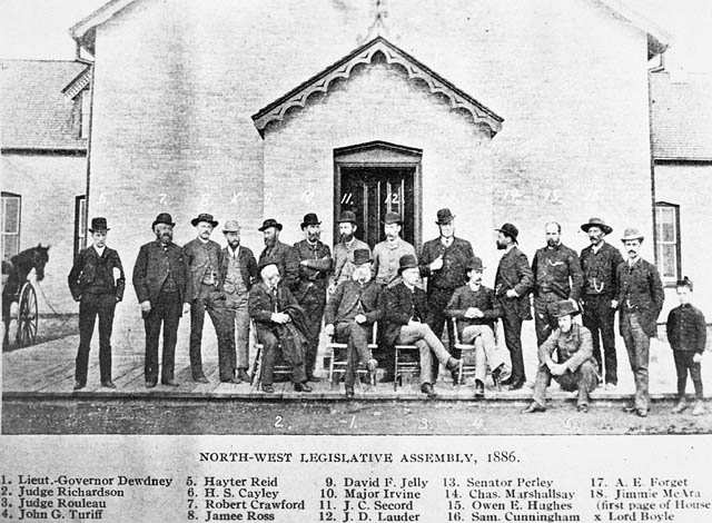 English:  Legislative Assembly of the Northwest Territories members outside of the territorial government building in  Regina, Saskatchewan.