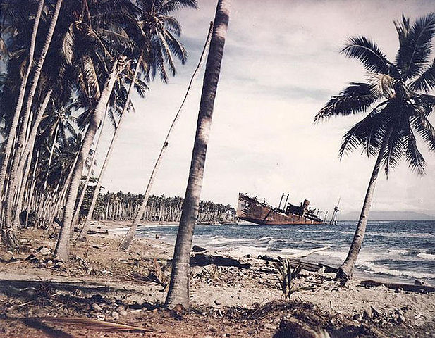 The wreck of one of the four Japanese transports, Kinugawa Maru, beached and destroyed at Guadalcanal on November 15, 1942, photographed one year later. Other version (with header) at  Image:KinugawaMaru.jpg Removed header reads "Photo # 80-G-K-1467-A Japanese transport Kinugawa Maru beached on Guadalcanal, November 1943."