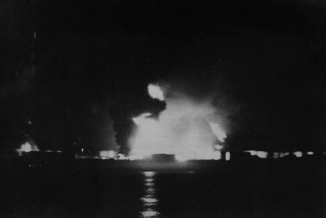 English: The Banyas oil terminal in Syria after being ignited with 76 mm shells from Israeli Saar boats