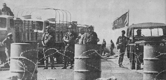 English: Egyptian trucks cross on one of the bridges laid across the Suez Canal during the Yom Kippur War