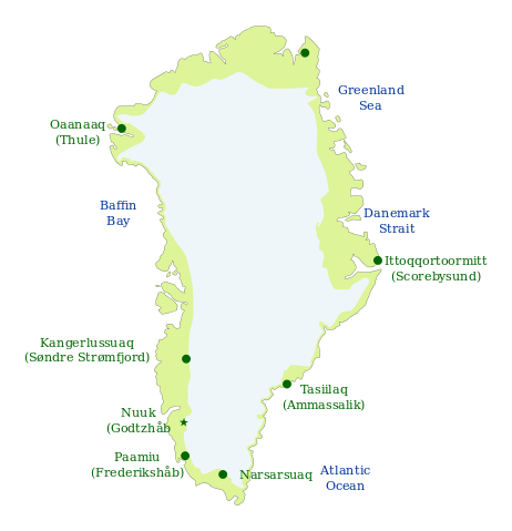 SVG Version of the Greenland map by  Walden69. SVG Version by  ExplicitImplicity Original description follows. Greenland map, based on a CIA map. Permission is granted to copy, distribute and/or modify this document under the terms of the GNU Free Documentation License, Version 1.2 or any later version published by the Free Software Foundation; with no Invariant Sections, no Front-Cover Texts, and no Back-Cover Texts Subject to disclaimers. File history Legend: (cur) = this is the current file, (del) = delete this old version, (rev) = revert to this old version. Click on date to download the file or see the image uploaded on that date. (del) (cur) 22:21, 2 March 2003 . . Menchi . . 492x802 (67829 bytes) (+ accents) (del) (rev) 21:55, 2 March 2003 . . Menchi . . 492x802 (66936 bytes) (Greenland map (big), based on CIA map) — Walden69 19:12, 22 December 2005 (UTC) |