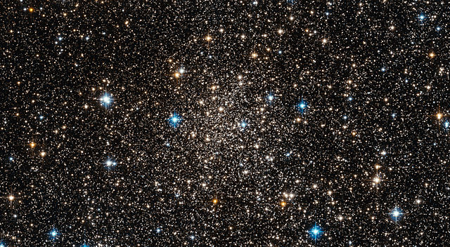 English: The NASA/ESA Hubble Space Telescope has imaged an area so jam-packed with stars that they almost overwhelm the inky blackness of space. This includes the globular star cluster Djorgovski 1, which was only discovered in 1987Djorgovski 1 is located close to the centre of our Milky Way Galaxy, within the bulge. If the galaxy is thought of as being like a city, then this bulge is the very busiest district at its centre. Djorgovski 1's proximity to this hub — within just a few degrees — explains why the picture is teeming with stars.