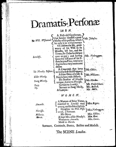 I created this image by downloading the appropriate scan (image no. 7 of 53) from Colley Cibber's Love's Last Shift from Early English Books Online in .gif format in the highest resolution available (400% of original size), cropping it in Adobe Photoshop to get one page instead of two, and saving the result as a .png file. Bibliographical information:
