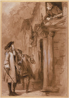 Scene from John Vanbrugh's The Relapse (1696) - Midnight alarm, with Fashion, Lory and Sir Tunbelly (3.3)