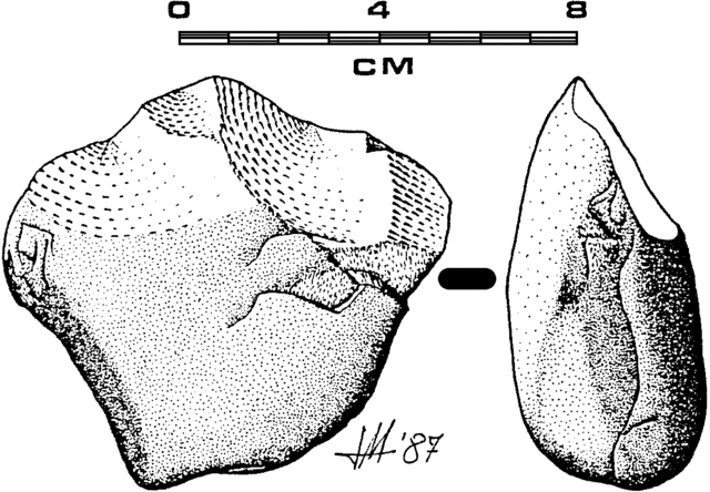 Français : Galet taillé en quartzite façonné avec taille en une seule des faces du galet. Cette piece fût ramassé d'une terrace fluviatile de la riviere du Trabancos (Valladolid, vallée du Duero) et a etté daté dans l'Acheuleen (Paleolithique Inferieur)