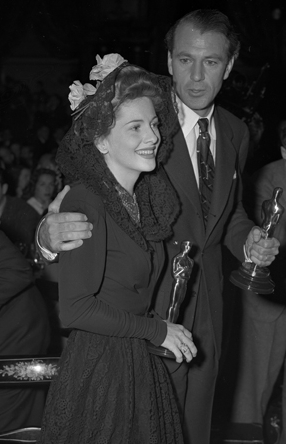 English: Actors Gary Cooper and Joan Fontaine holding their Oscars at Academy Awards after party, 1942