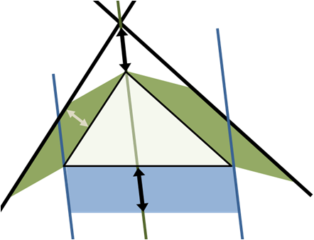 English: Generalization of Pythagoras' theorem to scalene triangle. Arrowhead joins intersection of lines parallel to sides to the corner of the triangle. This vector forms the two sides of the bottom parallelogram. The red area is the same as the sum of the green areas, as shown by George Jennings (1997) "Figure 1.32: The generalized Pythagorean theorem" in  Modern geometry with applications: with 150 figures (3rd ed.), Springer, p. 23  ISBN:  038794222X.