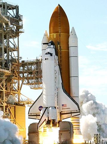 English: Smoke begins pouring out of the flame trench on Launch Pad 39A at NASA's Kennedy Space Centre as space shuttle Discovery lifts off on its STS-124 mission to the International Space Station. Launch was on time at 5:02 p.m. EDT. At left is the fixed service structure with the 80-foot lightning mast on top. Discovery is making its 35th flight. The STS-124 mission is the 26th in the assembly of the space station.
