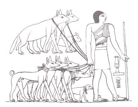 Français : Le Tesem est une race égyptienne reconnue pour être l'ancêtre des lévriers. Figurent 4 Tesems (bas) et 3 hyènes (haut), origine possible tombeau de Ptah Hotep à Saqqara.