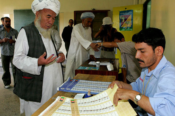 Description Afghan men waits to receive ballot from election worker during the successful parliamentary and provincial elections held on September 18, 2005. The elections are a major step forward in Afghanistan's development as a democratic state governed by the rule of law.