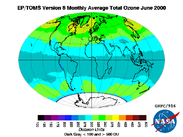 Downloaded from ftp://toms.gsfc.nasa.gov/pub/eptoms/images/monthly_averages/ozone/IM_ozavg_ept_200006.png. Total ozone column for June 2000 as measured by the EP-TOMS instrument.