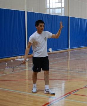 English: Lemuel Sibulo, USA, does a forehand service in a badminton match.