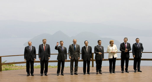 With Lake Toya as a backdrop, leaders of the Group of Eight pose for the official family photograph Tuesday, July 8, 2008, in Toyako, Japan. White House photo by Eric Draper |