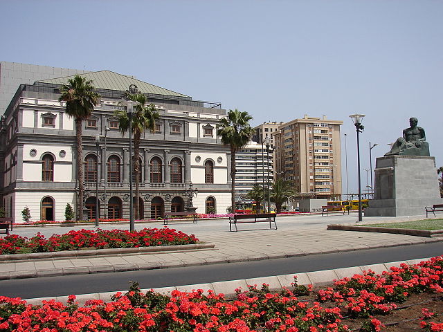 Español: Teatro Pérez Galdós y monumento al escritor grancanario Benito Pérez Galdós. Vista general. Las Palmas de Gran Canaria, Gran Canaria. Islas Canarias. España.