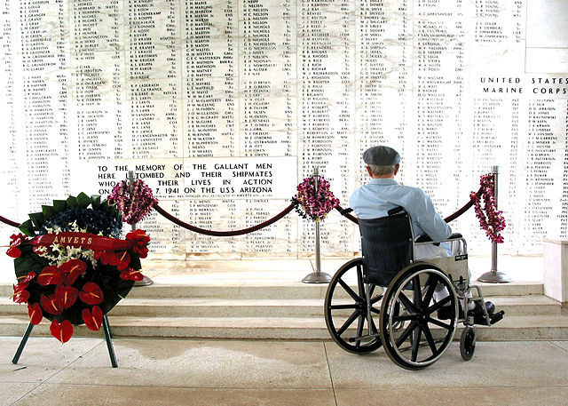 English: Pearl Harbor, Hawaii (Jan. 20, 2004) -- Pearl Harbour survivor Bill Johnson stares at the list of names inscribed in the USS Arizona Memorial. Johnson visited the memorial to pay respects to the Sailors killed that day, particularly his friend and high school buddy, W N Royals, 64 years after the attack. He also met with Rear Adm. Paul F. Sullivan, Commander, U.S. Submarine Force U.S. Pacific Fleet, who presented him with a command coin. He also received a pier side tour of USS La Jolla (SSN 701) and toured the Bowfin Museum. Johnson served in the U.S. Navy as a Torpedoman 1st Class for seven years and made several patrols aboard USS Holland and USS Devilfish. While on Patrol in the Pacific aboard USS Devilfish, Johnson and his shipmates survived a kamikaze attack and also managed to escape an enemy minefield. U.S. Navy photo by Chief Journalist David Rush. (RELEASED)