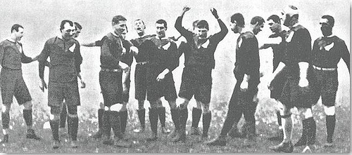 The Original All Blacks in 1905, during the "haka" ceremony. |