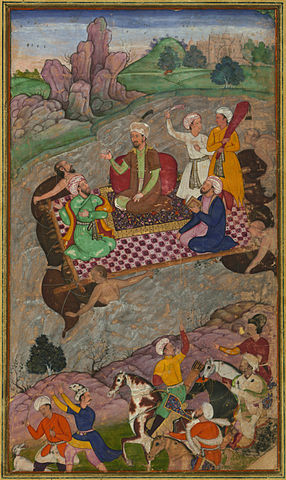 English: Illustrations from the Manuscript of Baburnama (Memoirs of Babur) - Late 16th CenturyBāburnāma is the memoirs of Ẓahīr ud-Dīn Muḥammad Bābur (1483-1530), founder of the Mughal Empire and a great-great-great-grandson of Timur. It is an autobiographical work, originally written in the Chagatai language, known to Babur as "Turki" (meaning Turkic), the spoken language of the Andijan-Timurids. Because of Babur's cultural origin, his prose is highly Persianized in its sentence structure, morphology, and vocabulary,and also contains many phrases and smaller poems in Persian. During Emperor Akbar's reign, the work was completely translated to Persian by a Mughal courtier, Abdul Rahīm, in AH (Hijri) 998 (1589-90).  These Paintings, being a fragment of a dispersed copy, was executed most probably in the late 10th AH /16th CE century. It contains 30 mostly full-page miniatures in fine Mughal style by at least two different artists. Another major fragment of this work (57 folios) is in the State Museum of Eastern Cultures, Moscow.