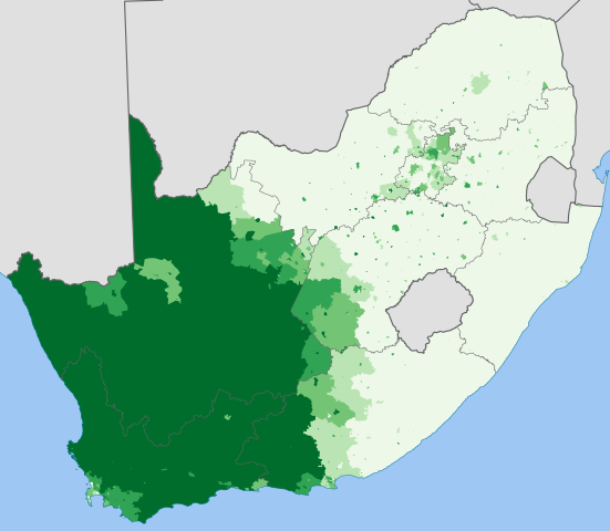English: Map showing the proportion of the South African population that speaks Afrikaans at home, from the 2001 census broken down to "Main Place" level.