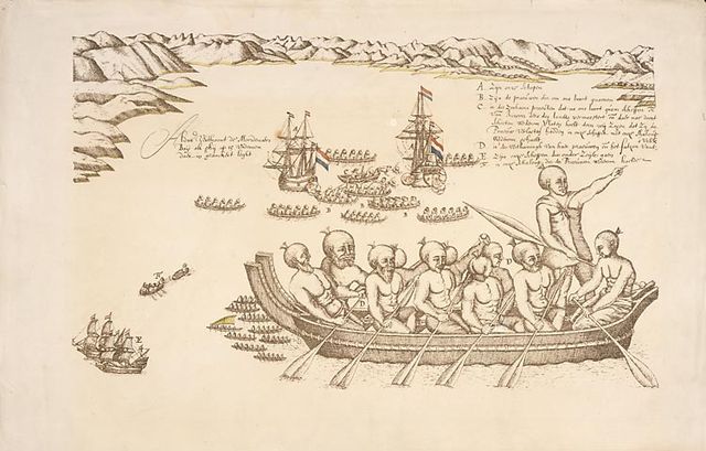English: "A view of the Murderers' Bay, as you are at anchor here in 15 fathom", a drawing made by Abel Tasman's artist on the occasion of a skirmish between the Dutch explorers and Māori people at what is now called Golden Bay, New Zealand. This is the first European impression of Māori people.