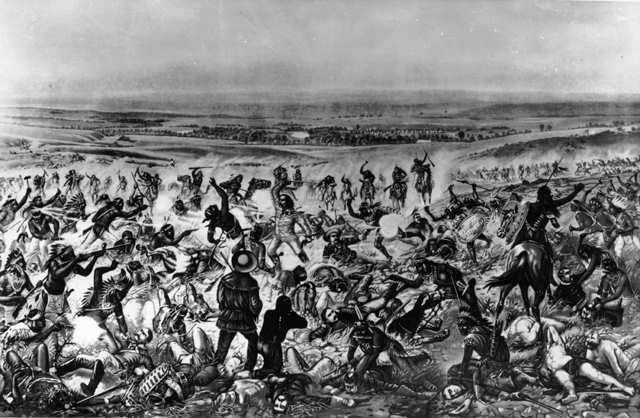 Title: Custer's last stand Caption: Native American Lakota Sioux, Crow, Northern, and Cheyenne, defeat General Custer standing centre, wearing buckskin, with few of his soldiers of the Seventh Cavalry still standing, Little Bighorn Battlefield, June 26, 1876 Little Bighorn River, Montana.  Template:Denver Public Library public domain images |