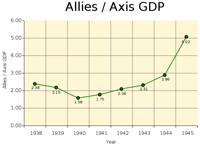 This table shows the relationship in GDP (Gross Domestic Product) between the Allies and the Axis, from 1938 to 1945, counted in international dollars and 1990 prices. The vertical axis shows the relationship, i.e. 2.00 means the Allied production was 2 times larger than the Axis. Please note that only the following countries are included: Austria, France, Germany, Italy, Japan, UK, USA and the Soviet Union.