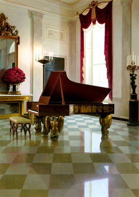 English: The White House Entrance Hall facing northwest, in a photograph by Zhen-Huan Lu. The photograph was used in the 2002 White House holiday greeting card. The grand piano was built by Steinway.