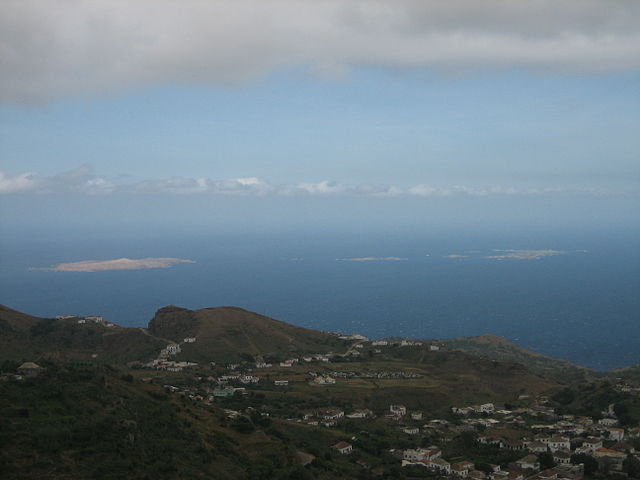 English: The uninhabited island group Ilhéus Secos or Ilhéus do Rombo with parts of the city of Nova Sintra on Brava, Cape Verde.