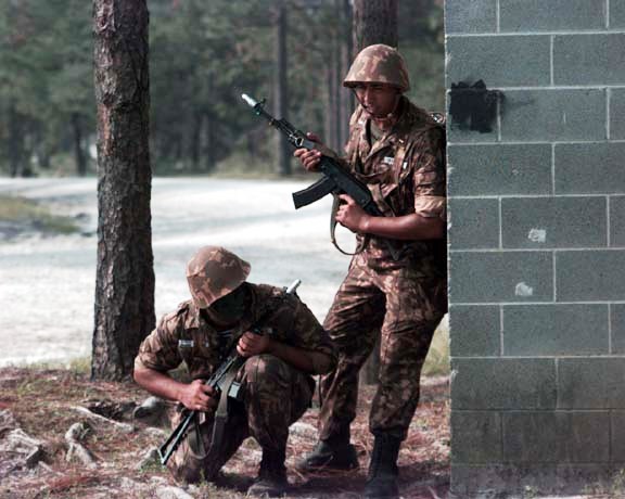 English: A pair of Ukbekistani troops prepare to charge a building and capture "rebel" forces as part of their mission during Exercise Cooperative Osprey '96. Fifteen former Soviet Union or Warsaw Pact nations trained with Dutch, Canadian and U.S. forces recently at Camp Lejeune, N.C. Master Sgt. Stephen Barrett, USA.