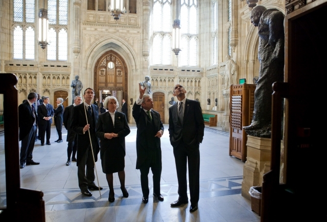 English: The Marquess of Cholmondeley, the Lord Great Chamberlain, Baroness Hayman, the Lord Speaker, John Bercow, the Speaker of the House of Commons, and Barack Obama, the President of the United States, in the Members' Lobby during a tour of the Palace of Westminster prior to the President's speech to the Parliament of the United Kingdom on 25 May 2011.