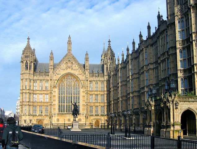View of  Old Palace Yard and part of the West Front of the  Palace of Westminster (Houses of Parliament) in London. The bronze statue of  King Richard I can be seen in front of the South Window of Westminster Hall, and the porte-cochère of Peers' Entrance is to the right. The concrete barriers restricting access to Old Palace Yard occupy the foreground; the top of the Clock Tower ( Big Ben) can be seen behind the corner turret in the middle. |
