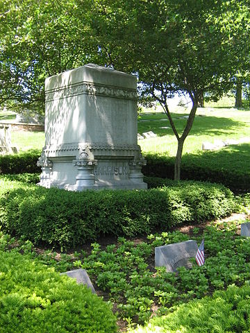 English: Grave of President Benjamin Harrison and his two wives in Indianapolis, Indiana.