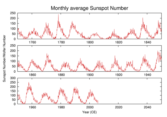 This chart depicts average monthly  Sunspot Number variation since 1750. This figure was produced by  Leland McInnes using gnuplot. All data is from publicly available sources. |