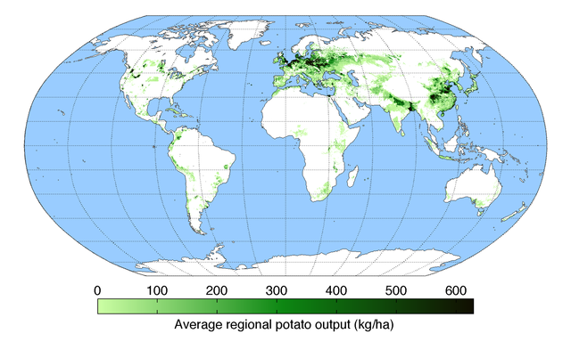 English: Map of potato production (average percentage of land used for its production times average yield in each grid cell) across the world compiled by the University of Minnesota Institute on the Environment with data from: Monfreda, C., N. Ramankutty, and J.A. Foley. 2008. Farming the planet: 2. Geographic distribution of crop areas, yields, physiological types, and net primary production in the year 2000. Global Biogeochemical Cycles 22: GB1022