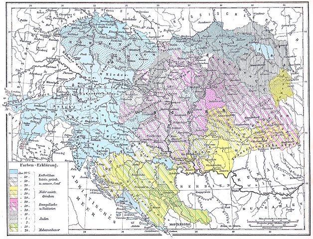 Religions in Austria-Hungary, Andrees Allgemeiner Handatlas, 1st Edition, Leipzig (Germany) 1881, Page 48, Map 2.