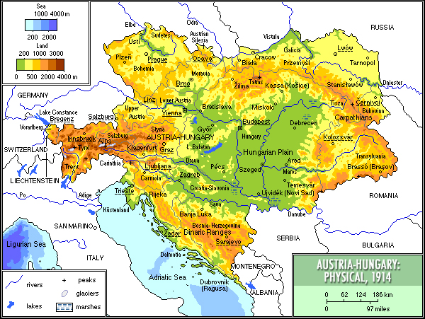 Austria-Hungary 1914, physical/Mapa fizyczna Austro-Węgier 1914