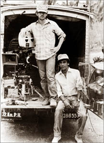 English: Director Steven Spielberg and Production supervisor Chandran Rutnam on location in Sri Lanka during the filming of Indiana Jones and the Temple of Doom starring Harrison Ford and Kate Capshaw, a Lucasfil UK production and a Paramount Pictures release.