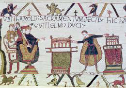 English: Bayeux Tapestry. "HAROLD SACRAMENTUM FECIT WILLELMO DUCI", (Harold makes his oath to the Duke). King Harold makes an oath of fealty to William, Duke of Normandy, by touching two altars containing relics of saints. It was the breaking of this purported oath which caused the Norman Conquest of England. The scene occurred at Bagia (Bayeux), as the previous scene in the Tapestry states.