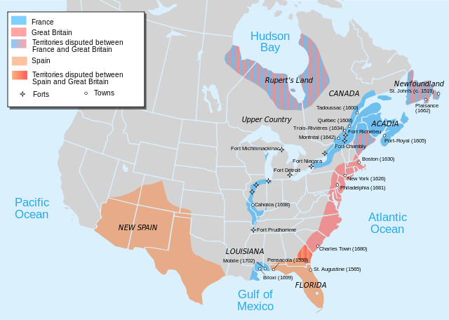 English: A map depicting the state of European occupation of  North America at the start of  Queen Anne's War, as the North American theatre of the  War of the Spanish Succession is known.Areas that are solid colour are intended to represent approximate areas of occupation, and do not represent claimed lands, which were generally much larger. Areas with conflicting claims are depicted with colour gradation, and may or may not be occupied by either side.  Many of these land claims also intersect lands claimed by Native Americans, which are not shown.