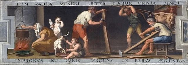English: One of four frieze paintings in the King's Antechamber ilustrating the Virgil’s Georgics: Tum uariae uenere artes. labor omnia uicit improbus et duris urgens in rebus egestas (G.I, 145-146).