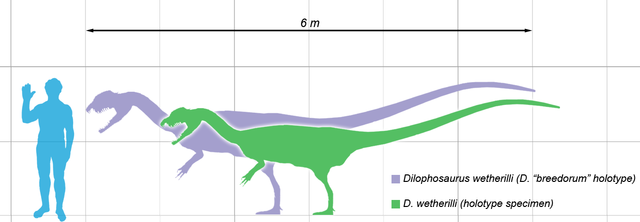 English: Size comparison of Dilophosaurus wetherilli, and a human. Modified from skeletal diagrams by Ville Sinkkonen.