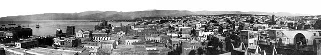 Français : Vue panoramique sur la ville de Beyrouth, au Liban, réalisée dans le dernier tiers du XIXe siècle, par un membre de la Maison Bonfils, une prolifique et prospère compagnie de photographie. Cette image a été obtenue en assemblant manuelement quatre clichés indépendants. La Maison Bonfils a été fondée et dirigée par le photographe français Félix Bonfils (1831–85), sa femme Marie-Lydie Cabanis Bonfils (1837–1918), et leur fils , Adrien Bonfils (1861–1928). Elle est célèbre pour ses photos de paysages, de scènes bibliques et de portraits "ethnographiques", qui constituent l'une des plus importantes collections de photos anciennes du moyen-orient.