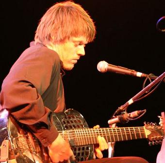 This is a photo of James Michael Thompson playing his one-of-a-kind 8 string baritone tricone resonator guitar. |