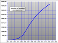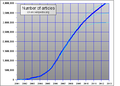 English: Number of articles on en.wikipedia.org and Gompertz extrapolation