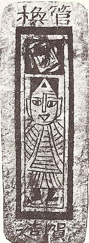 A Chinese playing card found near Turfan, dated c. 1400 AD during the Ming Dynasty. From the Museum fur Volkerkunde, Berlin. Its dimensions are 9.5 cm by 3.5 cm.